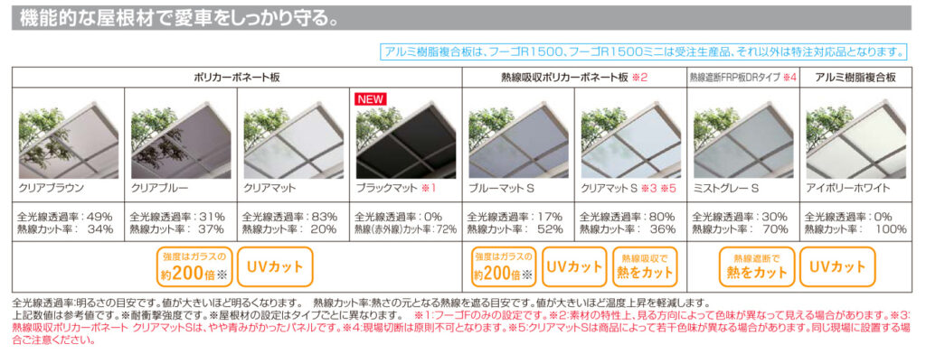 ・ ポリカーボネート板や熱線吸収タイプなど、紫外線カット・遮熱も選べる。