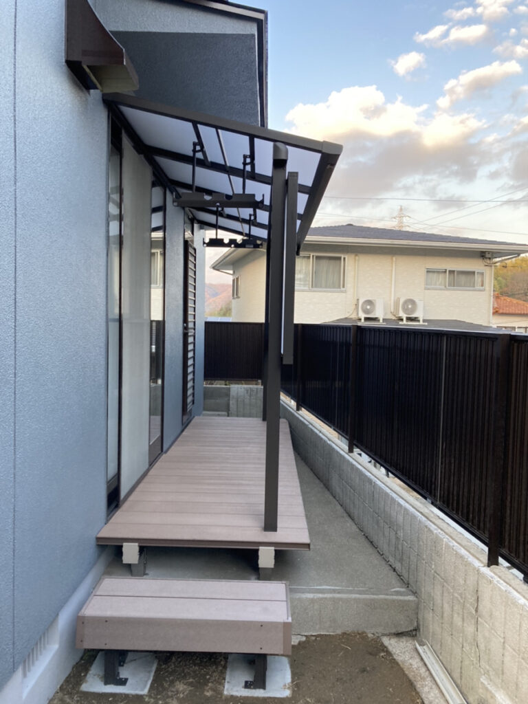 屋根付きのデッキ空間が完成し、雨の日でも洗濯物が干せる便利なスペースとなりました。